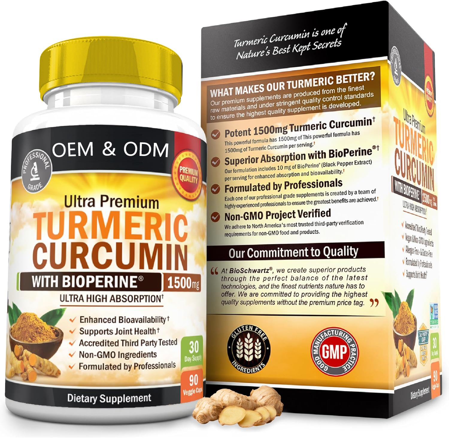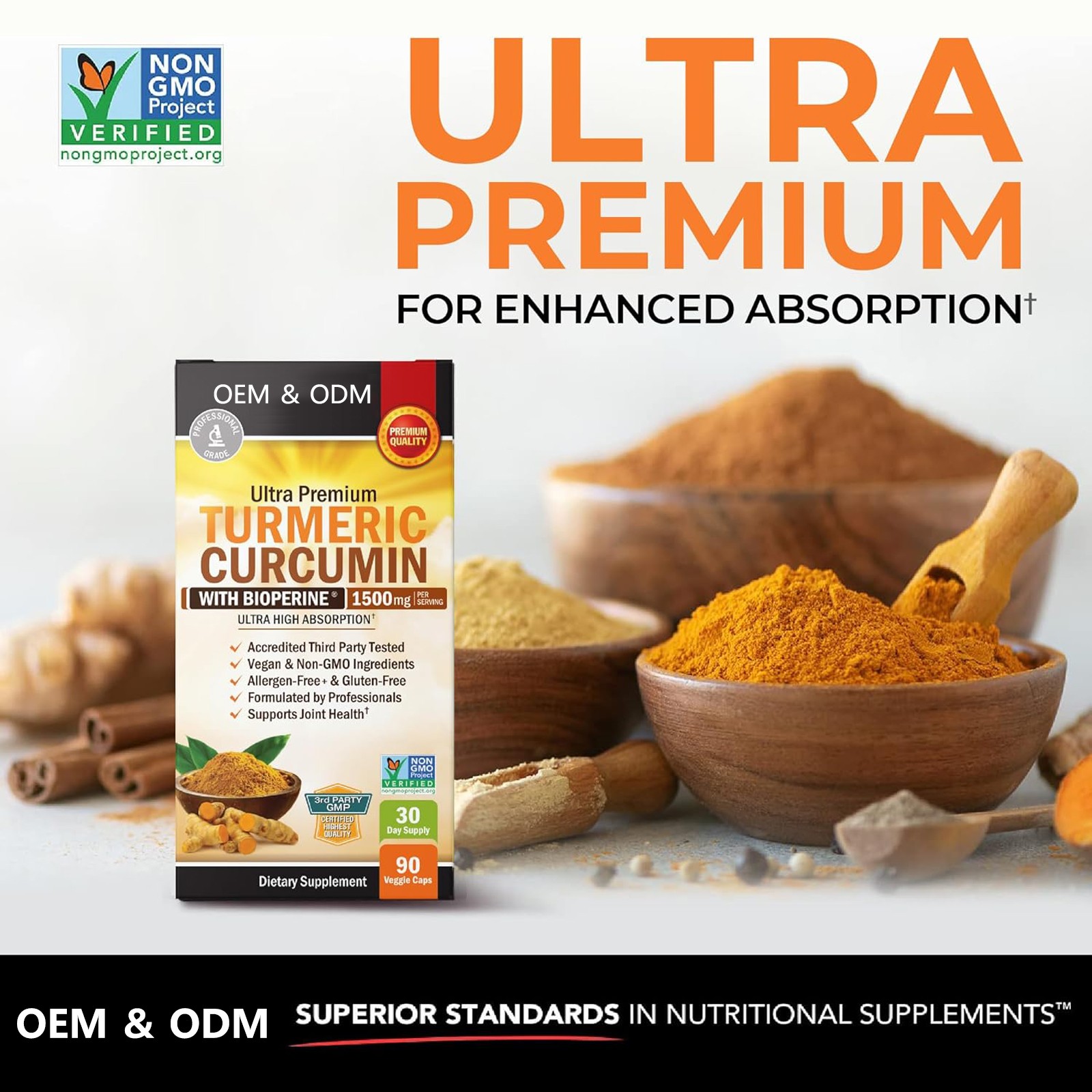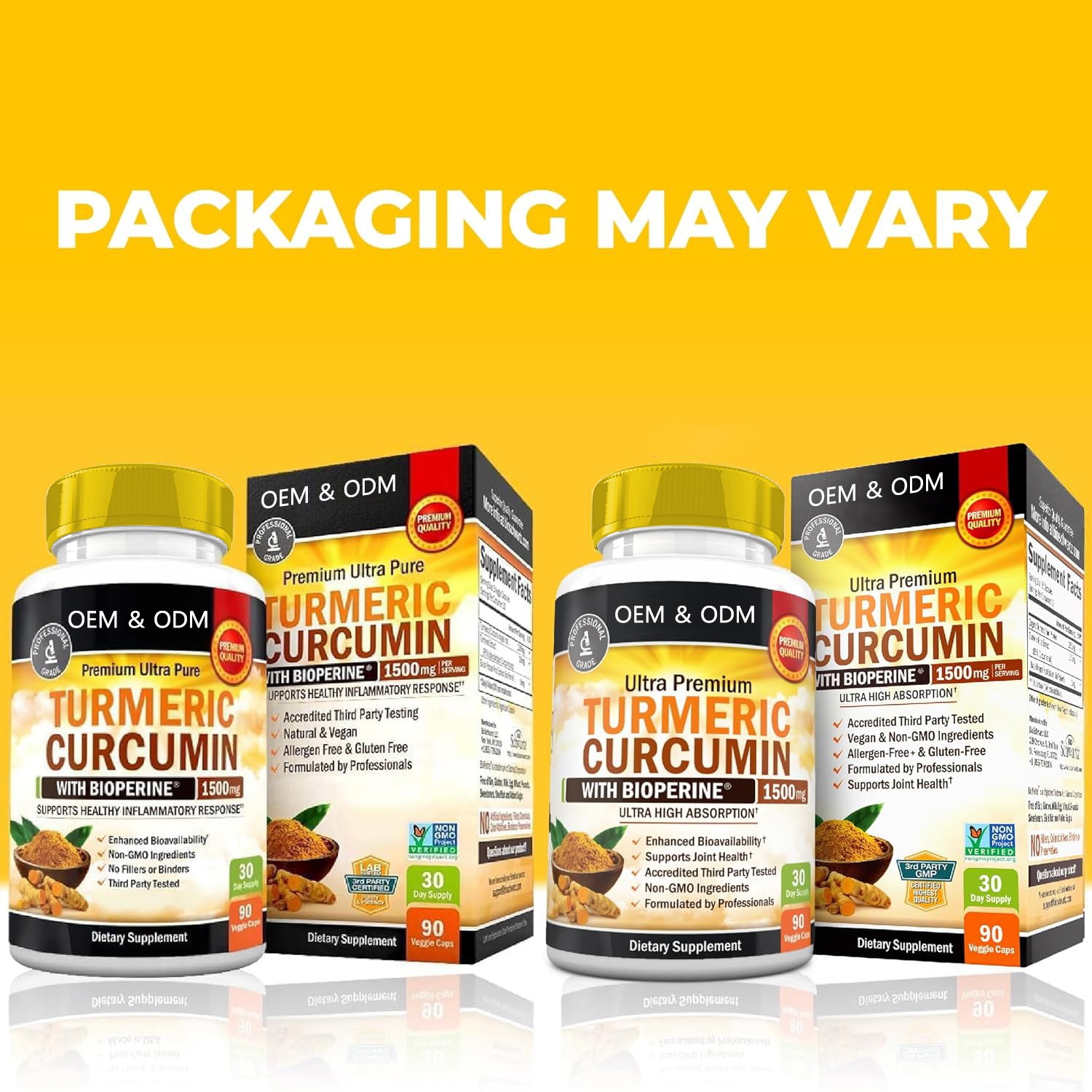 OEM High Potency Organic Turmeric Curcumin Capsules 1500mg 90ct - BioPerine Absorption Extract Blend Immune Joint Muscle Flexibility Support Vegan Non-GMO Gluten-Free GMP Tested Professional Grade