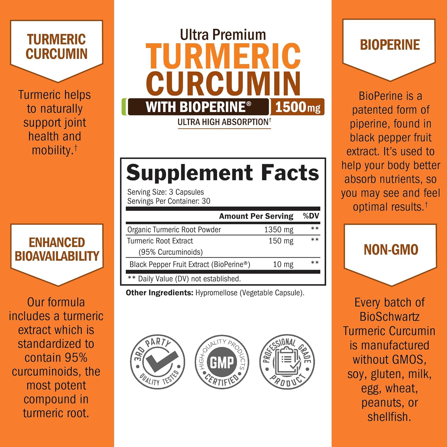 Ultra High Absorption: BioPerine (10mg black pepper extract) enhances curcumin bioavailability by up to 2000%, ensuring faster and more effective delivery of 150mg curcuminoids for optimal results.