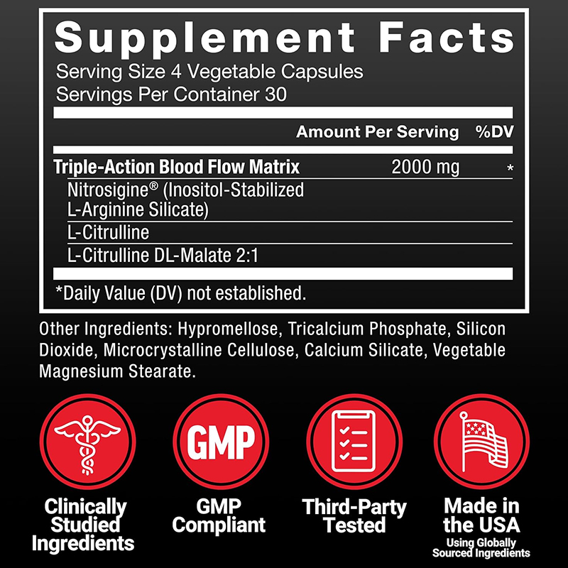 Triple-Action Nitric Oxide Boost: 2000mg Nitrosigine®, L-Citrulline & 2:1 L-Citrulline DL-Malate per serving to naturally elevate nitric oxide, enhance blood flow, and support lasting muscle pumps.
