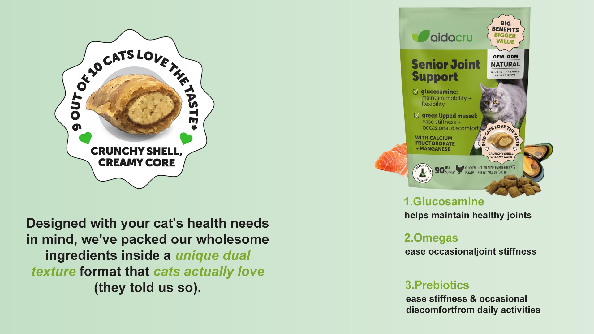 Digestive issues are among the top concerns for cat owners. Aidacru’s Cat Probiotic Bites combine a potent 5-strain probiotic blend with prebiotics to provide a comprehensive gut-health solution. For wholesalers, this is a "must-have" SKU that drives high customer lifetime value (CLV) due to the necessity of daily administration.