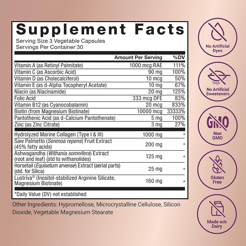 Benefits for Hair and Skin: 1000 mg of hydrolyzed marine collagen, combined with Ashwagandha and saw palmetto, promotes new hair growth, increases hair thickness, and reduces fine lines and wrinkles.