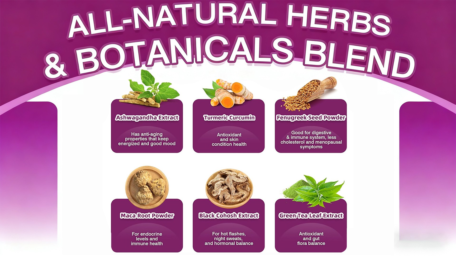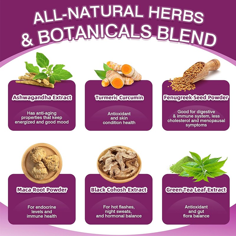 13-in-1 Herbal Complex for Hormone Balance: Infused with Black Cohosh, Maca, Fenugreek, Green Tea, Turmeric, and Ashwagandha, this formula helps enhance energy, improve mood, balance pH, and naturally relieve hot flashes and menopause discomfort.
