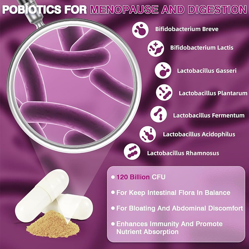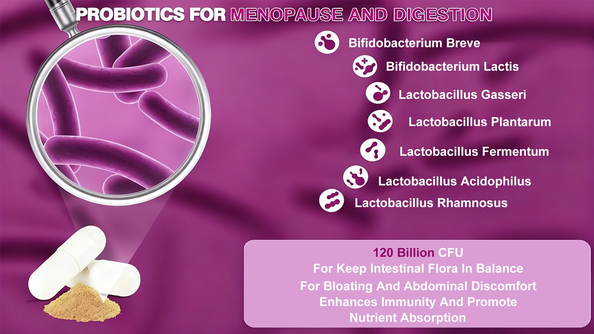 High-Potency Probiotic Support for Menopause: Each capsule delivers 12 Billion CFU from 7 clinically studied strains, promoting gut balance, easing bloating, supporting nutrient absorption, and boosting immunity—specially designed for digestive fluctuations during menopause.
