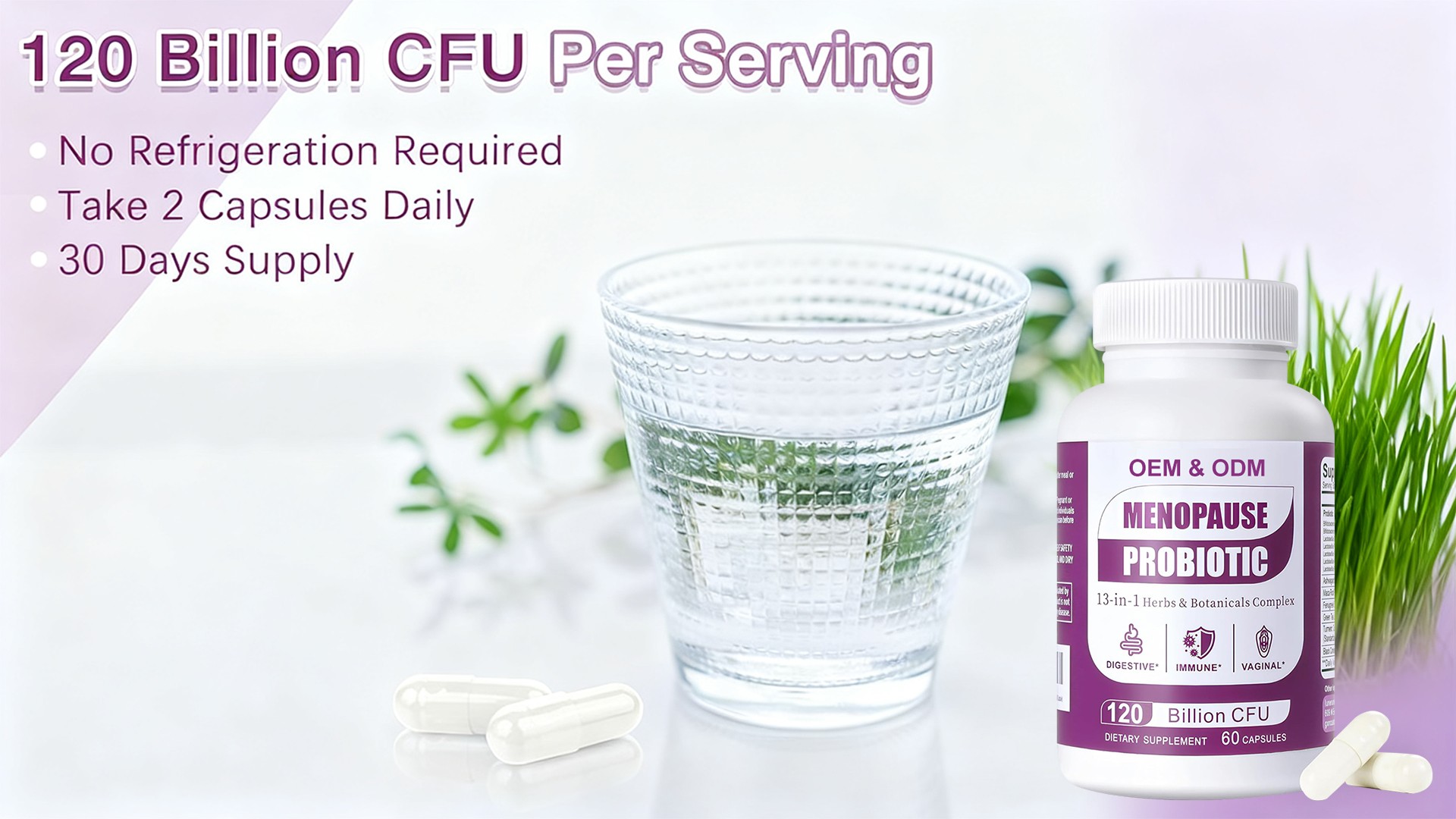 Comprehensive Menopause Support: Combines probiotics and botanicals to enhance immunity, improve digestive regularity, maintain vaginal health, and boost vitality—designed for women 40+ navigating menopausal changes.