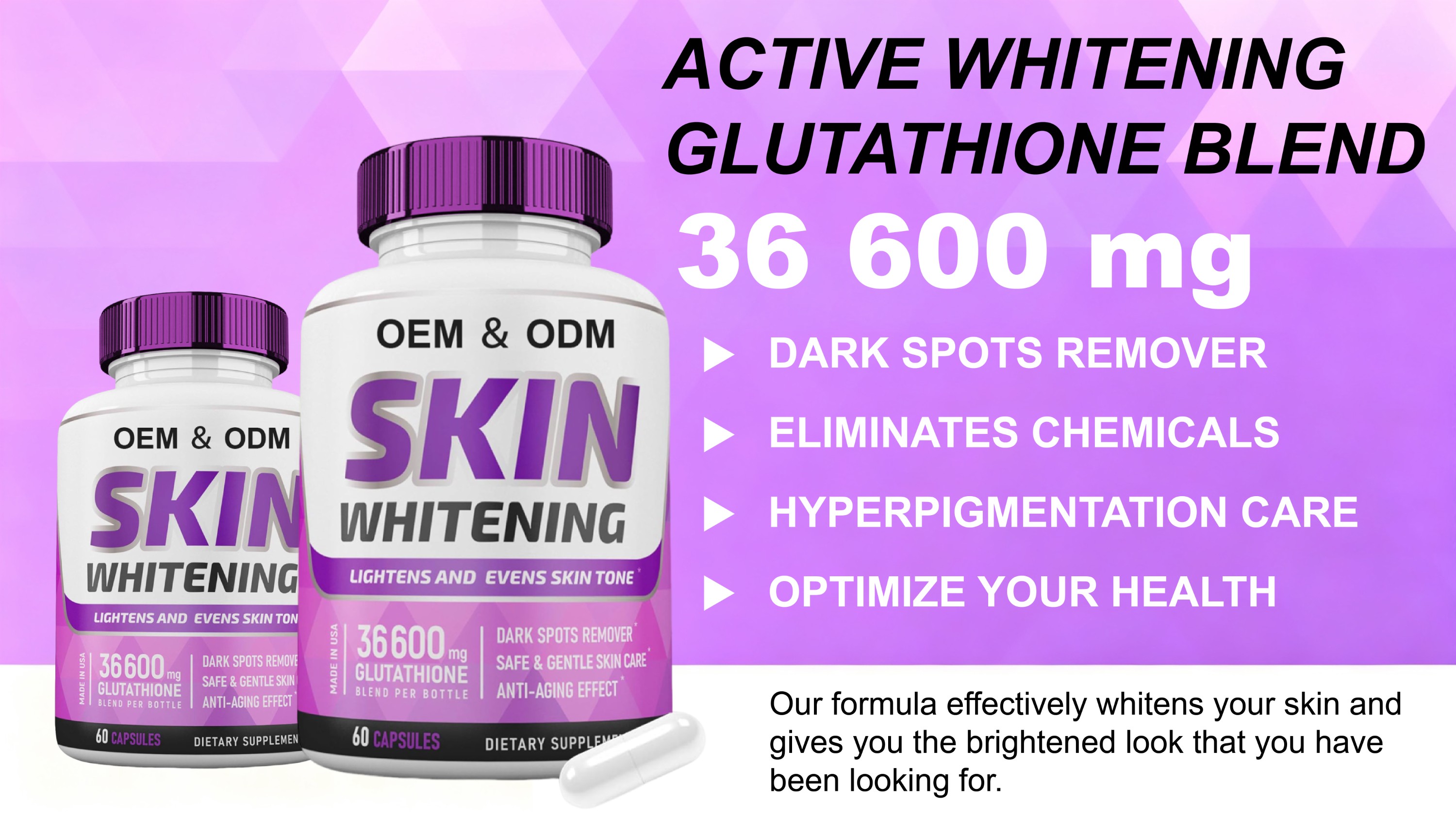 We offer custom glutathione and collagen capsule manufacturing services for supplement and beauty brands focusing on skin whitening, brightening, and anti-aging benefits. Our formulations combine L-Glutathione, Collagen, and optional vitamins to create functional capsules tailored to beauty and wellness needs.