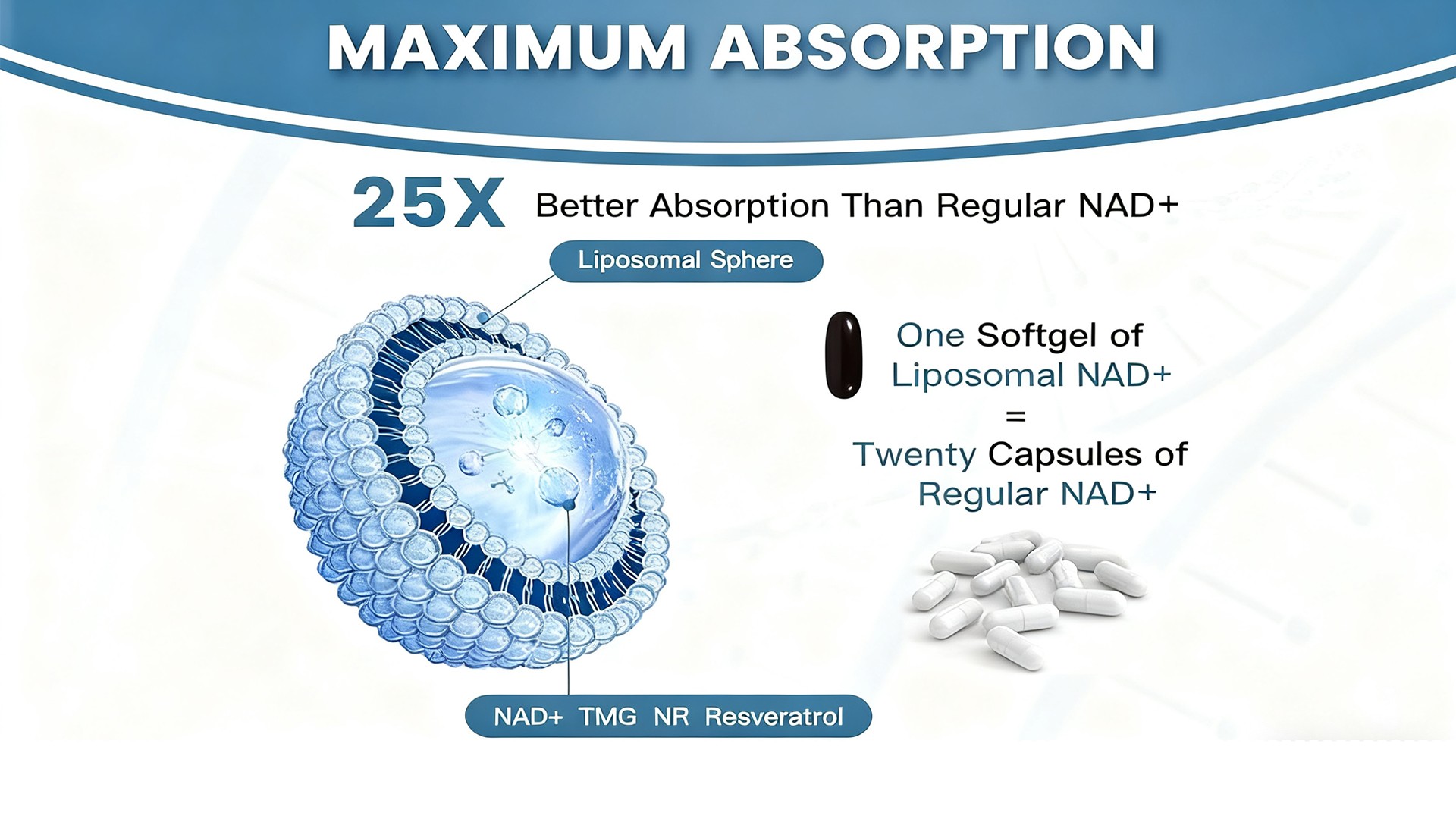 25x Superior Absorption & Actual NAD+ Delivery: Liposomal encapsulation shields 120mg pure NAD+ (Nicotinamide Adenine Dinucleotide) from stomach degradation, offering 25x better bioavailability than regular forms—one softgel equals 20 capsules for direct cellular fueling and immediate vitality.