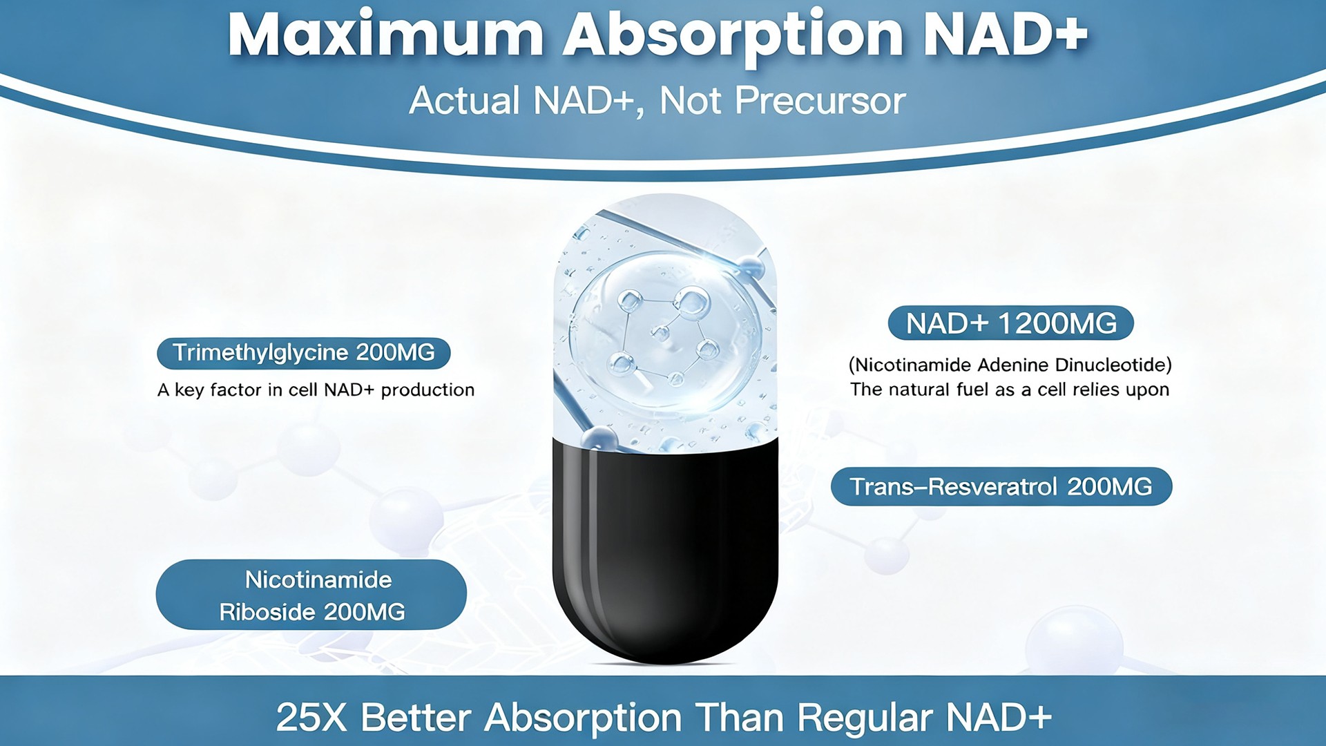 Synergistic 1800mg Formula: Blends TMG (Trimethylglycine 200mg) for methylation, Trans-Resveratrol (200mg) for sirtuin/antioxidant activation, and Nicotinamide Riboside (NR 200mg) to elevate NAD+ levels and counter age-related decline.