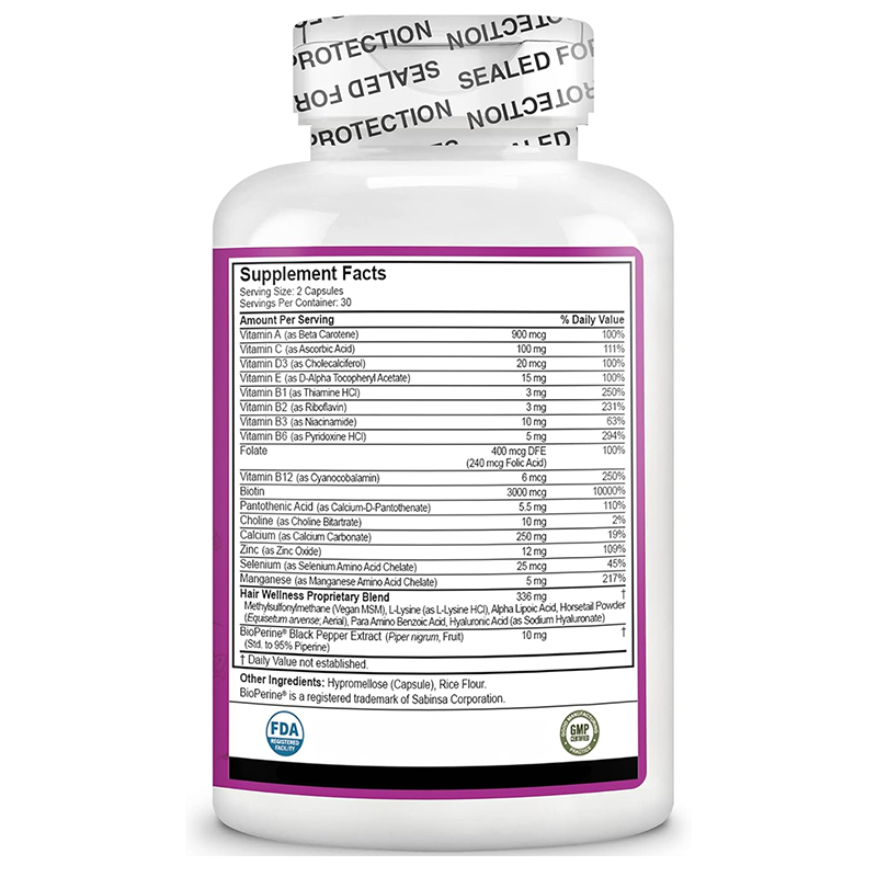 Enhanced Absorption Formula: MSM, L-lysine, alpha-lipoic acid, horsetail extract, para-aminobenzoic acid (PABA), hyaluronic acid, and BioPerine® (a black pepper extract) promote nutrient absorption, increase hair volume, reduce hair loss, and improve shine and elasticity.