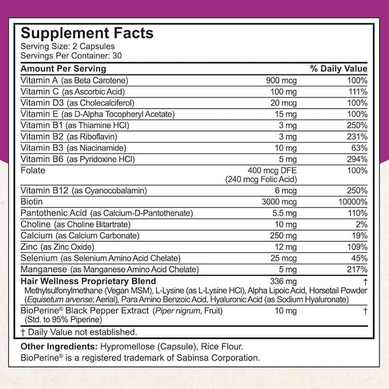 Comprehensive Hair Nourishment: High-dose biotin (3000 mcg, 10000% of daily intake), full-spectrum vitamins (A, C, D, E, B vitamins), and minerals (zinc, selenium, calcium) nourish hair follicles, promoting hair strength, growth, and regeneration.