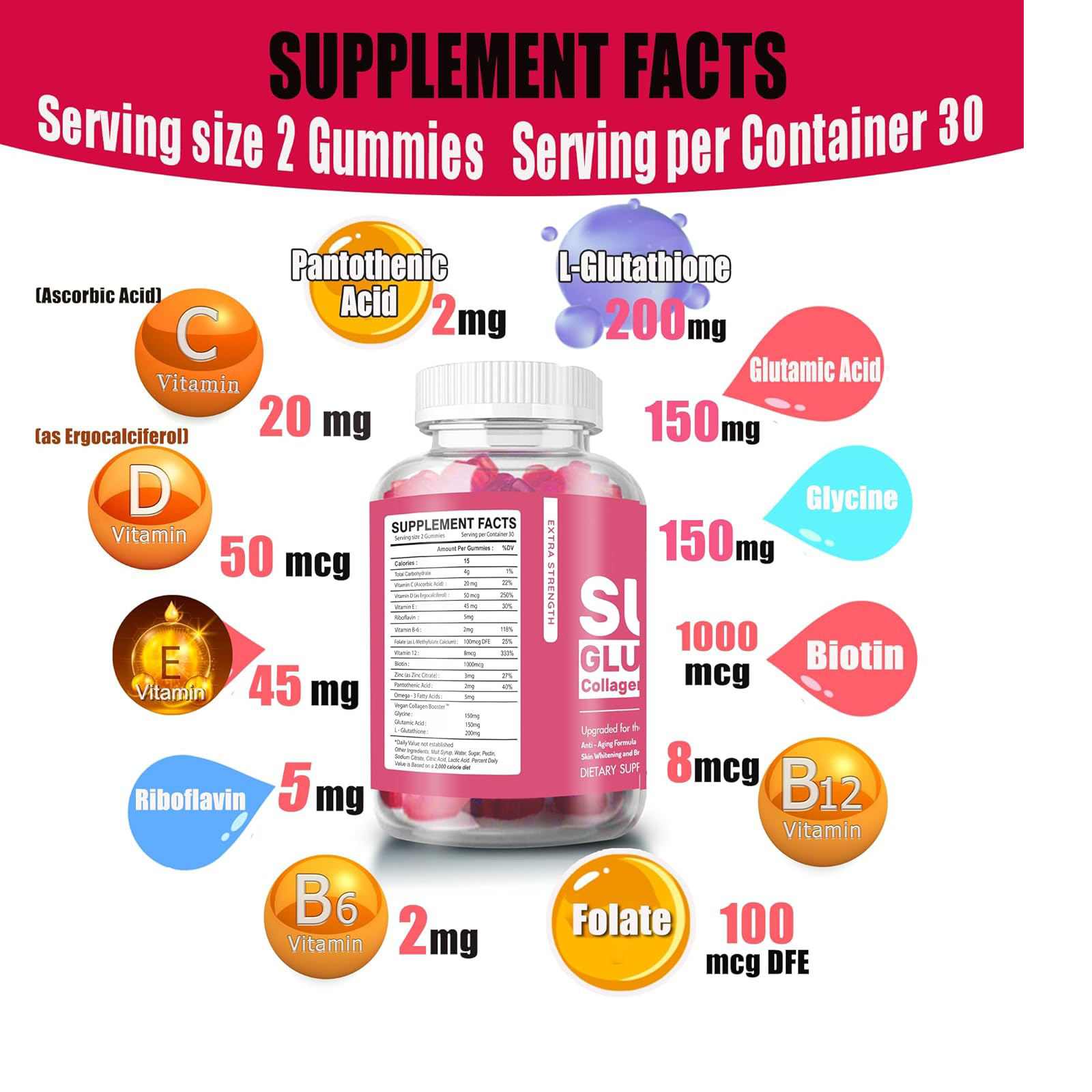 High-Potency Glutathione & Collagen: Each gummy delivers 200mg L-Glutathione and 1000mg collagen to reduce dark spots, boost brightness, and improve elasticity. Visible results in 3 weeks.