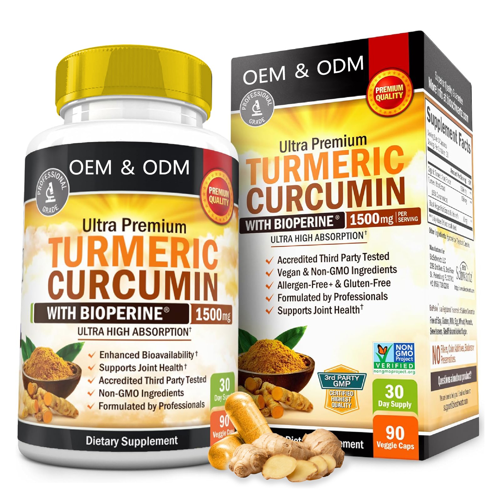OEM High Potency Organic Turmeric Curcumin Capsules 1500mg 90ct - BioPerine Absorption Extract Blend Immune Joint Muscle Flexibility Support Vegan Non-GMO Gluten-Free GMP Tested Professional Grade